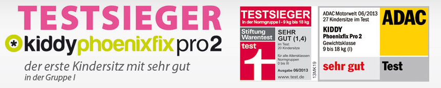 Mit dem neuen Kindersitz kiddy Phoenixfix pro 2 erhielt erstmals ein Sitz der Gruppe 1 die Bestnote „Sehr gut“ in den Tests von ADAC und Stiftung Warentest. Bestwerte in den Kategorien Sicherheit, Handhabung und Schadstoffbelastung führen zu einer Gesamtnote von 1,4. Dies ist das beste Ergebnis, das beim Marktstart von kiddy Phoenixfix pro 2 je für einen Kindersitz der Gruppe 1 (9 bis 18 kg) vergeben wurde.